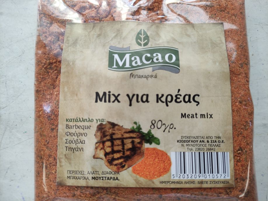 Ο Ε.Φ.Ε.Τ. και ειδικότερα η Περιφερειακή Διεύθυνση Κεντρικής Μακεδονίας, κατά τη διενέργεια ελέγχων στο πλαίσιο του Προγράμματος «Επίσημος Έλεγχος για την παρουσία αλλεργιογόνων ουσιών σε ορισμένα είδη τροφίμων» έτους 2021, προέβη σε δειγματοληψία τροφίμου με στοιχεία: «ΜΙΓΜΑ ΜΠΑΧΑΡΙΚΩΝ» με την επωνυμία MACAOMIX ΓΙΑ ΚΡΕΑΣ, με ημερομηνία ανάλωσης κατά προτίμηση 12/2024 και αριθμό παρτίδας LOT 2005 προέλευσης Ε.Ε. σε διαφανή περιέκτη των 80 γραμμαρίων που συσκευάζεται και διανέμεται στην Ελλάδα από την ΚΙΟΣΟΓΛΟΥ ΑΝ. & ΣΙΑ Ο.Ε.- «MACAO» με έδρα τον Νέο Μυλότοπο Π.Ε. Πέλλας.