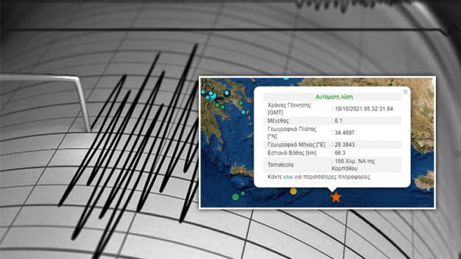 Σεισμική δόνηση μεγέθους 6,1 βαθμών της κλίμακας Ρίχτερ σημειώθηκε στις 08:32 το πρωί σε θαλάσσια περιοχή ανοιχτά της Καρπάθου.