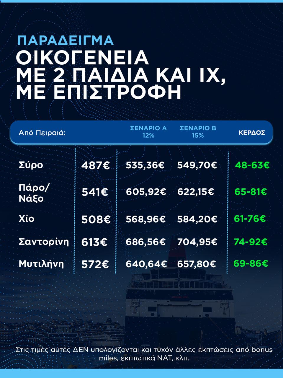 Επίσης, ένα ζευγάρι από Πειραιά για Σύρο με επιστροφή καταβάλλει σήμερα 186 ευρώ για τα εισιτήρια. Στην περίπτωση που αυξάνονταν κατα 12% η αύξηση θα ήταν στα 208 ευρώ και στο 15% στα 214 ευρώ.