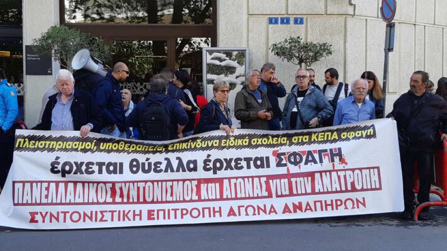 Στην κόλαση που μας ετοιμάζουν της πολεμικής οικονομίας, με τον αγώνα μας, με την αλληλεγγύη, με την αξιοπρέπειά μας, μαζί με τον λαό μας πετάμε στα τάρταρα τους εμπόρους της αναπηρίας το σύστημα της εκμετάλλευσης και αυτούς που το υπηρετούν!»