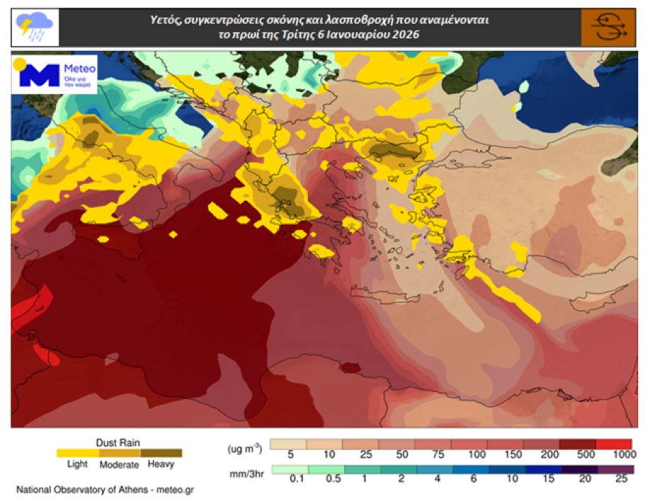 Η ατμοσφαιρική κυκλοφορία που επικρατεί επάνω από την Ευρωπαϊκή ήπειρο και τη Βόρεια Αφρική έχει ως συνέπεια τους ανέμους νότιας συνιστώσας σε μεγάλο τμήμα της Κεντρικής και Ανατολικής Μεσογείου, περιλαμβανομένης και της χώρας μας. Η κατάσταση στη χώρα μας, σε ότι αφορά τους ανέμους στην μέση και κατώτερη τροπόσφαιρα, δεν αναμένεται να αλλάξει σημαντικά έως την Πέμπτη 08/01. Αποτέλεσμα είναι οι αυξημένες συγκεντρώσεις Αφρικάνικής σκόνης στην ατμόσφαιρα και κατά συνέπεια η εκδήλωση λασποβροχών κατά τόπους.