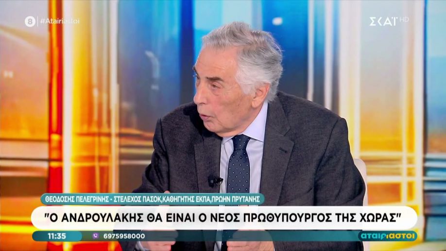 Στον ΣΚΑΪ και στην εκπομπή «Αταίριαστοι» (Χρήστος Κούτρας, Γιάννης Ντσούνος) εμφανίστηκε το πρωί ο πρώην πρύτανης του ΕΚΠΑ και πρώην υπουργός του ΣΥΡΙΖΑ, Θεοδόσης Πελεγρίνης, ο οποίος προσχώρησε πρόσφατα στο ΠΑΣΟΚ, στα πλαίσια της διεύρυνσης.