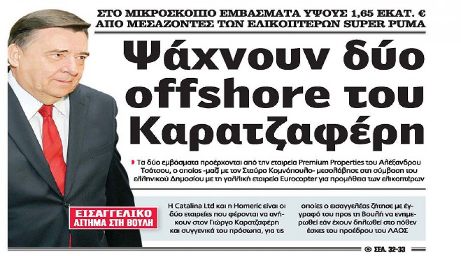 Με τίτλο: "Ψάχνουν δύο off shore του Καρατζαφέρη" κυκλοφορεί η Realnews, η οποία αποκαλύπτει εισαγγελικό αίτημα στη Βουλή για τον έλεγχο του πόθεν έσχες του Προέδρου του ΛΑΟΣ (από την Ποταμιά Αρκαδίας) με αφορμή εμβάσματα «ύψους 1,65 εκατ. ευρώ από μεσάζοντες των ελικοπτέρων Super Puma».
