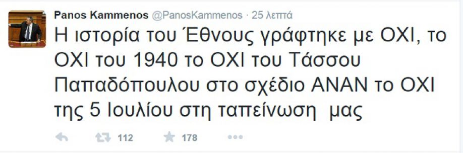 "Η ιστορία του Έθνους γράφτηκε με ΟΧΙ, το ΟΧΙ του 1940, το ΟΧΙ του Τάσσου Παπαδόπουλου στο σχέδιο Ανάν, το ΟΧΙ της 5ης Ιουλίου στην ταπείνωσή μας" έγραψε ο πρόεδρος των Ανεξαρτήτων Ελλήνων , Πάνος Καμμένος στον προσωπικό του λογαριασμό στο twitter.