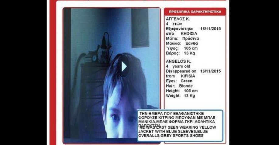 Στις 17/11/15 βρέθηκε στην Αθήνα, ο Άγγελος Κ. 4 ετών ο οποίος είχε εξαφανιστεί στις 16/11/2015 από την περιοχή της Κηφισιάς και είναι ασφαλής και καλά στην υγεία του.