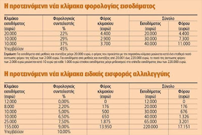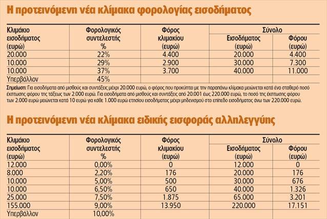 Στη νέα κλίμακα υπολογισμού του φόρου εισοδήματος για τους μισθούς και τις συντάξεις, την οποία έχει προτείνει η κυβέρνηση στους δανειστές, ο ελάχιστος συντελεστής φόρου 22% θα ισχύει για ετήσια εισοδήματα μέχρι 20.000 ευρώ, ενώ η έκπτωση φόρου μειώνεται από 2.100 σε 2.000 ευρώ. Πάνω από το επίπεδο ετησίου εισοδήματος των 20.000 ευρώ και μέχρι τα 30.000 ευρώ θα επιβάλλεται συντελεστής φόρου 29%, ενώ πάνω από τα 30.000 και μέχρι τα 40.000 ευρώ θα ισχύει συντελεστής φόρου 37%. Στο υπερβάλλον των 40.000 ευρώ τμήμα του ετησίου εισοδήματος θα επιβάλλεται συντελεστής φόρου 45%. Η έκπτωση φόρου των 2.000 ευρώ θα μειώνεται κατά 10 ευρώ για κάθε 1.000 ευρώ πρόσθετο εισόδημα πάνω από τα 20.000 ευρώ, οπότε θα μηδενίζεται στο επίπεδο ετησίου εισοδήματος των 220.000 ευρώ.