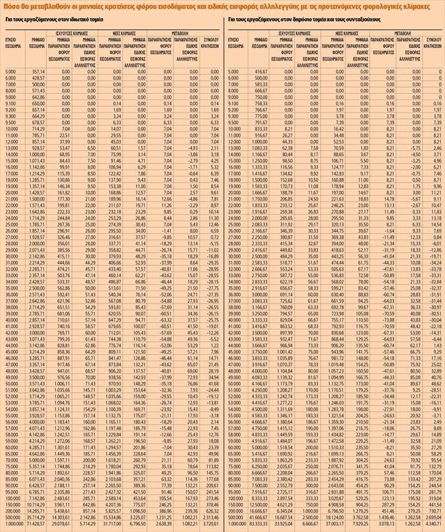 Αποτέλεσμα των μεταβολών αυτών στην κλίμακα φόρου εισοδήματος των μισθωτών και των συνταξιούχων είναι η μείωση του αφορολόγητου ορίου από τα 9.545 στα 9.090 ευρώ και η αύξηση των φορολογικών επιβαρύνσεων για όσους δηλώνουν ετήσια εισοδήματα πάνω από 9.545 και μέχρι 28.000 ευρώ, πάνω από 43.000 ευρώ και μέχρι 50.000 ευρώ, καθώς επίσης και άνω των 55.000 ευρώ. Αντιθέτως για όσους δηλώνουν ετήσια εισοδήματα πάνω από 28.000 ευρώ και μέχρι 43.000 ευρώ και πάνω από 50.000 έως 55.000 ευρώ προκύπτουν μειώσεις φορολογικών επιβαρύνσεων.