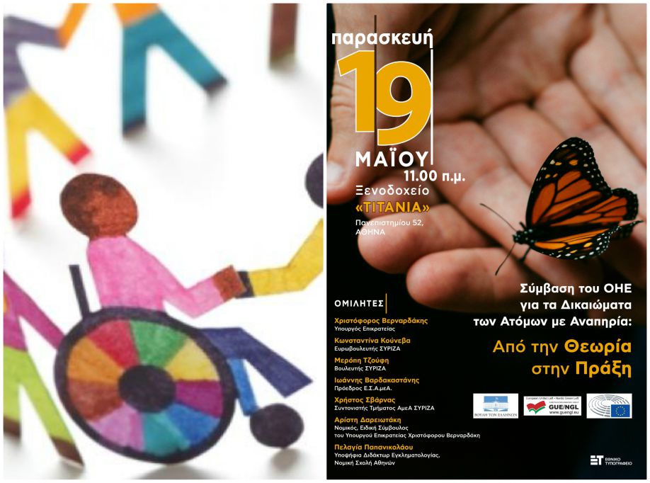 "Η Σύμβαση του ΟΗΕ για τα δικαιώματα των ατόμων με αναπηρία: Aπό την Θεωρία στην Πράξη", είναι ο τίτλος της εκδήλωσης-συζήτησης που συνδιοργανώνεται από τον Υπουργό Επικρατείας, Χριστόφορο Βερναρδάκη και την Ευρωβουλευτή του ΣΥΡΙΖΑ, Κωνσταντίνα Κούνεβα, την Παρασκευή 19 Μαΐου στο Ξενοδοχείο ΤΙΤΑΝΙΑ (Πανεπιστημίου 52), 11 π.μ.- 2.00 μ.μ.