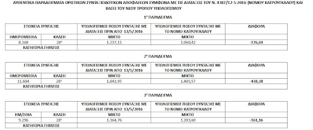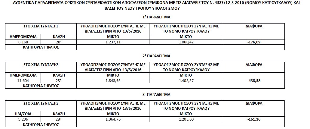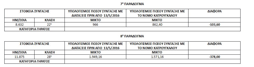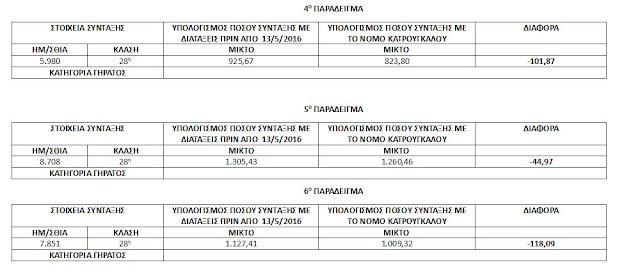 Για παράδειγμα ασφαλισμένος στο ΙΚΑ 28η κλάση ( 11.604 ένσημα) με το προηγούμενο καθεστώς θα ελάμβανε σύνταξη 1843.95 μικτά ενώ με το νέο καθεστώς λαμβάνει 1405.57. Η μείωση ανέρχεται σε 438.38 ευρώ.