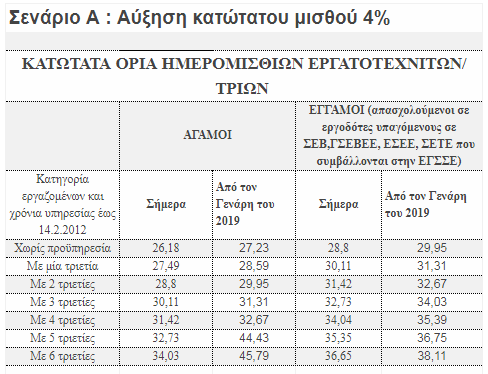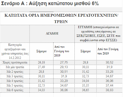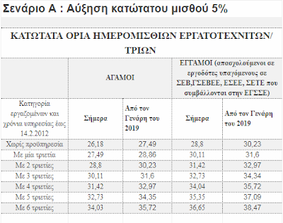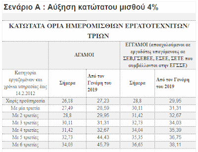 Δεδομένου ότι η κυβέρνηση έχει δεσμευτεί να καταργήσει τον υποκατώτατο μισθό που ισχύει σήμερα για τους νέους έως 25 ετών, ο νέος κατώτατος που θα νομοθετηθεί τον ερχόμενο Γενάρη θα ισχύσει για όλους χωρίς ηλικιακές διακρίσεις. Αξιοποιώντας όλα αυτά τα στοιχεία, το άρθρο παρουσιάζει αναλυτικούς πίνακες με τους νέους μισθούς και τα ημερομίσθια που θα ισχύουν από τον Γενάρη του 2019 με βάση τρία σενάρια αναπροσαρμογής των βασικών ποσών: αύξηση 4%, αύξηση 5% και αύξηση 6%.