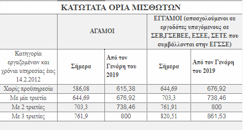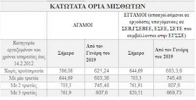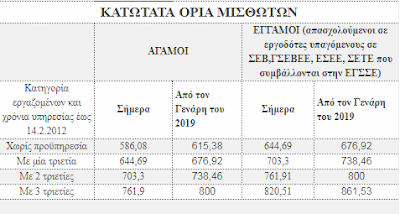 Νέο τοπίο θα διαμορφωθεί στις αποδοχές του ιδιωτικού τομέα με την αναπροσαρμογή του κατώτατου μισθού από τον Γενάρη του 2019. Η αύξηση των βασικών ποσών που μπορεί να κυμαίνεται από 3% έως και ελαφρώς πάνω από 5% επηρεάζει τις μηνιαίες αποδοχές των μισθωτών αλλά και τα ημερομίσθια των εργατών. Η αύξηση θα συμπαρασύρει ταυτόχρονα προς τα πάνω και τις αποδοχές όσων λαμβάνουν τα «παγωμένα» επιδόματα προϋπηρεσίας όπως επίσης και το επίδομα γάμου 10% λόγω υπαγωγής στην Εθνική Γενική Συλλογική Σύμβαση.
