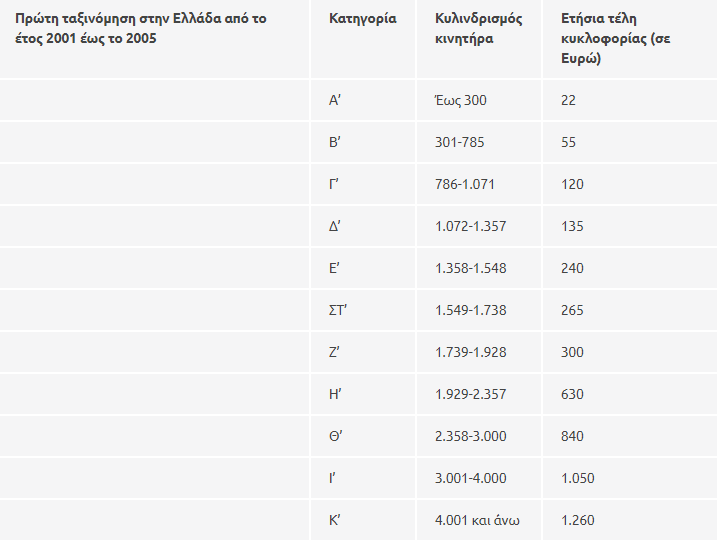 α) Επιβατικά αυτοκίνητα που έχουν ταξινομηθεί για πρώτη φορά στην Ελλάδα έως τις 31.10.2010 και δίκυκλες και τρίκυκλες μοτοσικλέτες ανεξαρτήτως της ημερομηνίας πρώτης ταξινόμησής τους στην Ελλάδα, με βάση τον κυλινδρισμό του κινητήρα αυτών, ως εξής: