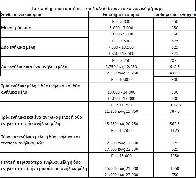 1. Εισοδηματικά. Ετήσιο εισόδημα μέχρι 9.000 ευρώ για νοικοκυριό με ένα ενήλικο μέλος προσαυξανόμενο, για κάθε νοικοκυριό με περισσότερα του ενός μέλη, κατά 4.500 ευρώ για κάθε επιπλέον ενήλικο μέλος και κατά 2.250 ευρώ για κάθε ανήλικο μέλος. Συγκεκριμένα το εισόδημα δεν πρέπει να υπερβαίνει: