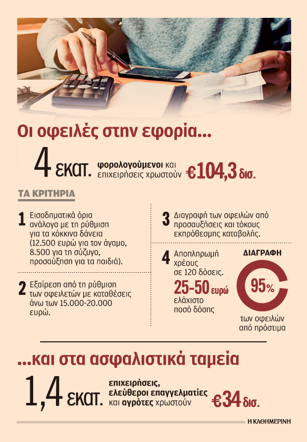 Σύμφωνα με πληροφορίες, στη ρύθμιση που αφορά τα χρέη στην εφορία θα εξαιρούνται, για παράδειγμα, όσοι φορολογούμενοι έχουν δεύτερες ή εξοχικές κατοικίες τις οποίες θα μπορούσαν να εκποιήσουν για να αποπληρώσουν τις οφειλές τους, ενώ θα ισχύσουν και εισοδηματικά όρια τα οποία θα προσαυξάνονται ανάλογα με το ύψος της οφειλής. Οι πιστωτές της χώρας δεν επιτρέπουν σε καμία περίπτωση τη θεσμοθέτηση ρύθμισης χωρίς όρους και προϋποθέσεις, όπως αρχικώς σχεδίαζε η κυβέρνηση, η οποία πλέον χρησιμοποιεί ως «μπούσουλα» τη ρύθμιση για την προστασία της πρώτης κατοικίας.