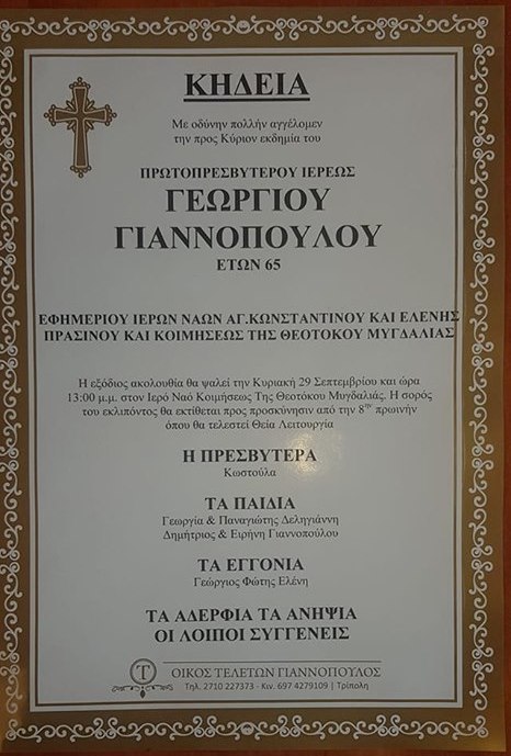Εκοιμήθη σε ηλικία 65 ετών ο ιερέας Γεώργιος Γιαννόπουλος ο οποίος ήταν εφημέριος των Ναών Αγίων Κωνσταντίνου και Ελένης στο Πράσινο και Κοιμήσεως της Θεοτόκου στη Μυγδαλιά Γορτυνίας.