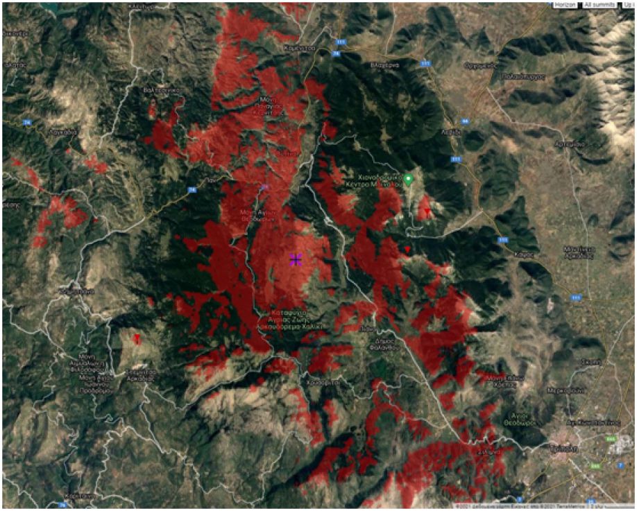 (το παρακάτω μοντέλο ορατότητας απεικονίζει με κόκκινο τα σημεία από όπου θα είναι ορατή στην ευρύτερη περιοχή μία ΜΟΝΟ από τις 12 ανεμογεννήτριες (αυτή με Α/Α 6)...)
