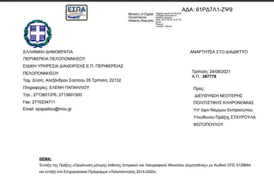Αυτή είναι η επίσημη για ένταξη στο ΕΣΠΑ του έργου για το Μουσείο Δημητσάνας