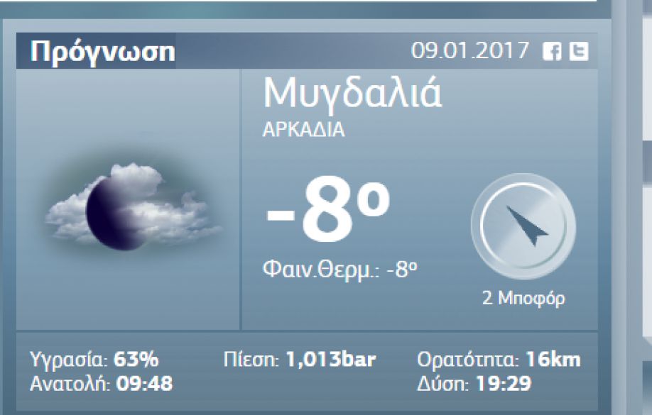 Σύμφωνα με το ιστολόγιο mygdalia.blogspot.gr, "οι παγωμένες σωληνώσεις έχουν αφήσει αρκετές μέρες το χωριό χωρίς νερό. Θα εξαρτηθεί από τις καιρικές συνθήκες των επόμενων ημερών η αποκατάσταση της ροής του νερού στις σωληνώσεις.