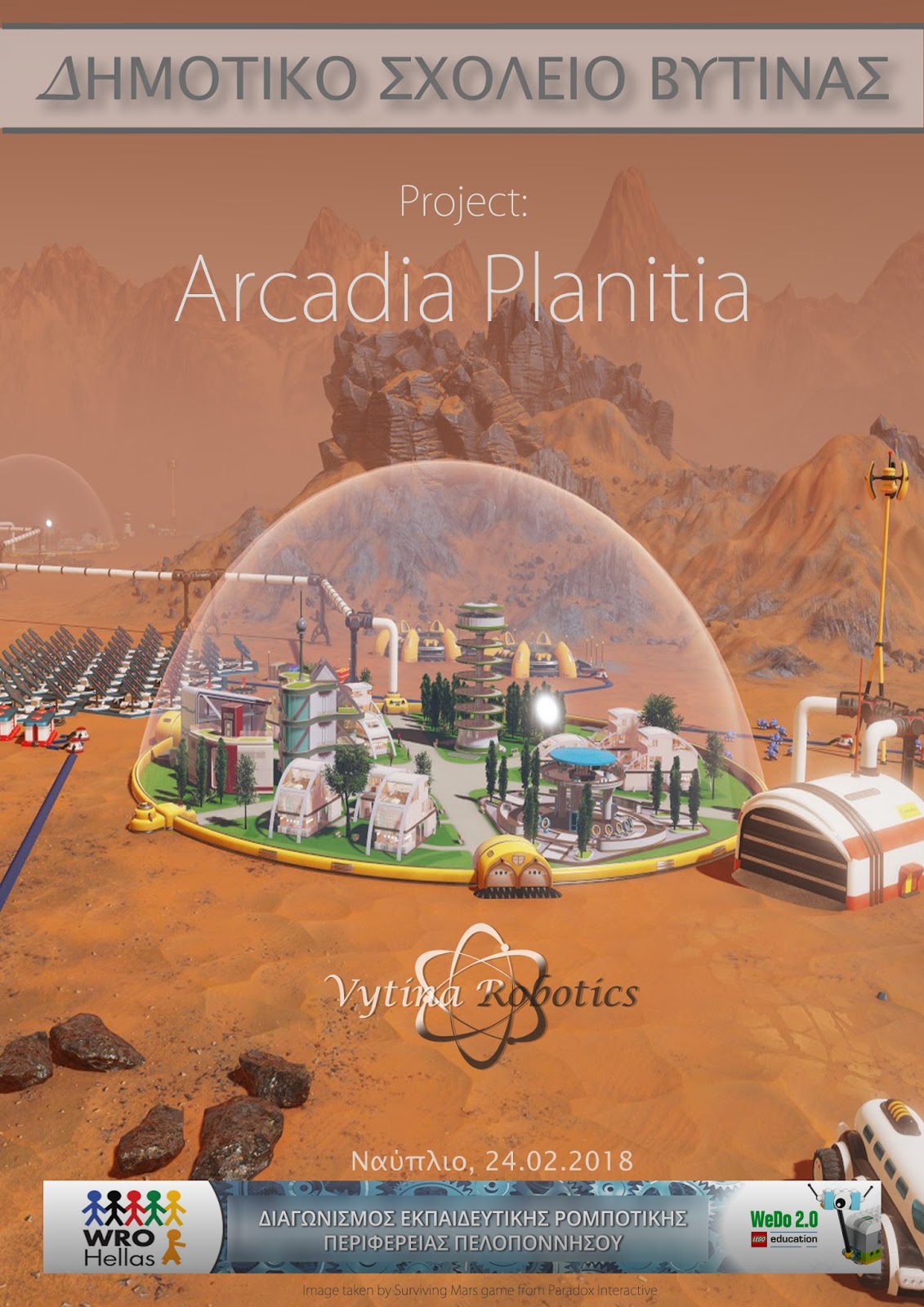 Σημαντική ήταν η διάκριση στη 2η θέση για την ομάδα ρομποτικής του Δημοτικού Σχολείου Βυτίνας «Vytina Robotics», που παρουσίασε στον διαγωνισμό το έργο με τίτλο «Arcadia Planitia» (ο τίτλος προέρχεται από την ομώνυμη περιοχή που βρίσκεται στον πλανήτη Άρη). Το έργο αφορά τη δημιουργία μιας φανταστικής αποικίας ανθρώπων στον γειτονικό πλανήτη Άρη, η οποία καλύπτεται από γυάλινο θόλο για τη διατήρηση της ζωής (η ατμόσφαιρα του Άρη αποτελείται μόνο από 0.14% οξυγόνο, ενώ της Γης κατά 21%). Επιπλέον, η ασπίδα προστασίας της αποικίας είναι έτοιμη να ενεργοποιηθεί και να προστατεύσει τον θόλο στην περίπτωση που το τηλεσκόπιο-ανιχνευτής, εντοπίσει κάποια διαστημική απειλή (μετεωρίτης, κοσμική ακτινοβολία) (η ατμόσφαιρα του Άρη είναι πολύ αραιή -25 teratonnes συγκριτικά με τους 5.148 teratonnes της Γης- με αποτέλεσμα ο πλανήτης να είναι διάτρητος από συγκρούσεις μετεωριτών).