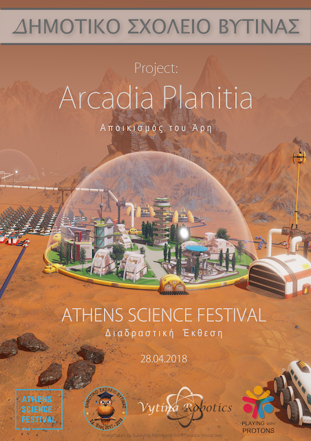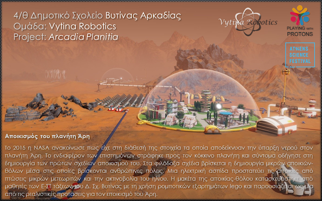 Πολύ μεγάλη βράβευση για το Δημοτικό Σχολείο Βυτίνας στα βραβεία Επικοινωνίας της Επιστήμης του Athens Science Festival, με το Σχέδιο Αποικισμού του πλανήτη Άρη, έργο που υλοποιήθηκε στο πλαίσιο του προγράμματος Playing with Protons, CERN.