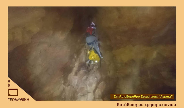 Η κεντρική δεσιά έγινε στον κεντρικό κορμό ενός σχοίνου δίπλα και ανατολικά από την είσοδο. Η κατάβαση στο πρώτο στένωμα είναι πλάγια για περίπου 6 μέτρα.