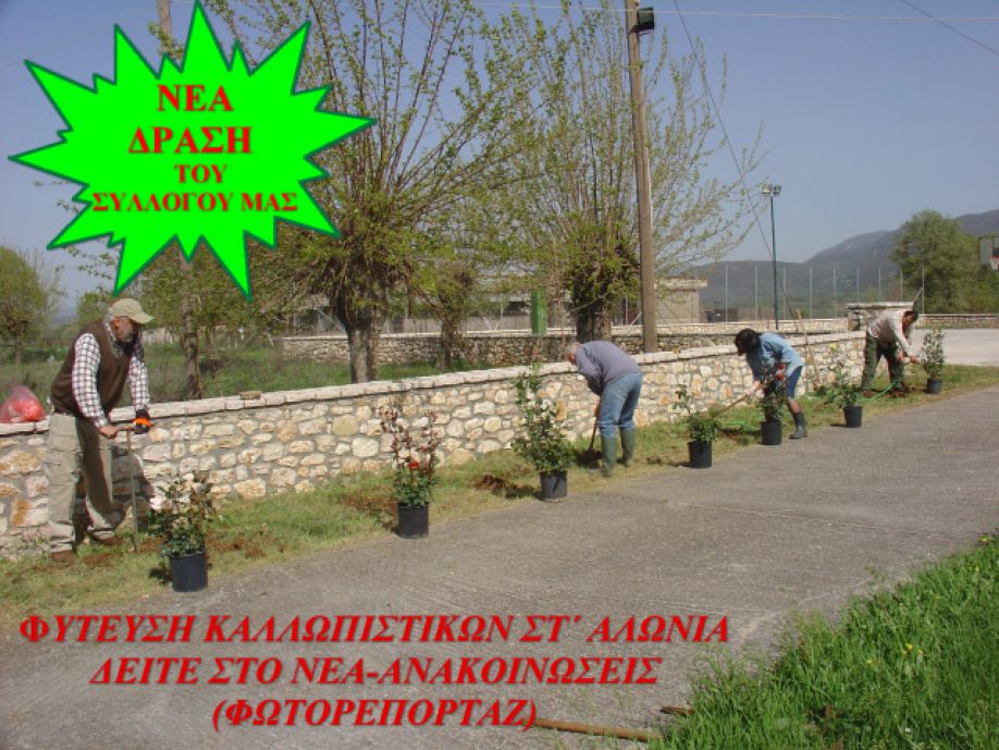 [#] την Κυριακή 26/4/2015 έγινε φύτευση καλλωπιστικών φυτών στον εξωτερικό χώρο της Αίθουσας στου Συλλόγου μας στ' Αλώνια. Έγινε επίσης καθαρισμός από τα χορτάρια. Με πολύ κέφι βοήθησαν στη διαδικασία, μέλη του Συλλόγου μας μαζί με Μέλη του Διοικητικού Συμβουλίου. Ευχαριστούμε θερμά τον Γιάννη Παν. Γαϊτανάκη και τον Θανάση Κ. Καλόμαλο που αγόρασαν τα φυτά και πάντα είναι κοντά στον Σύλλογο με τον τρόπο που ξέρουν. Ευχαριστούμε επίσης το μέλος του Συλλόγου μας Χρήστο Ι. Λαμπρόπουλο, που ως γεωπόνος μας έδωσε τις επιστημονικές του συμβουλές.