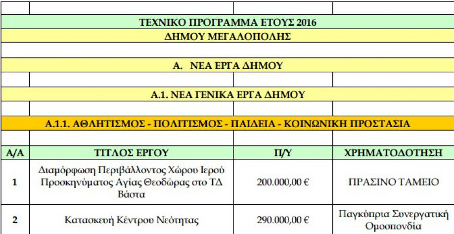 Με κατά πλειοψηφία απόφαση, το Δημοτικό Συμβούλιο Μεγαλόπολης κατάρτισε και ψήφισε το Τεχνικό Πρόγραμμα του Δήμου Μεγαλόπολης έτους 2016 με ιεραρχημένα τα έργα που πρέπει να εκτελεστούν, ανά Δημοτική Ενότητα (Γόρτυνος, Μεγαλόπολης και Φαλαισίας), στη Δημοτική Κοινότητα Μεγαλόπολης και σε κάθε Τοπική Κοινότητα ή Οικισμό, στο σύνολο του Δήμου Μεγαλόπολης, «που θα συμβάλλουν στην προστασία & αναβάθμιση του φυσικού και πολιτιστικού περιβάλλοντος, καθώς και στην οικονομική, τη κοινωνική και την τουριστική ανάπτυξη της περιοχής του Δήμου».