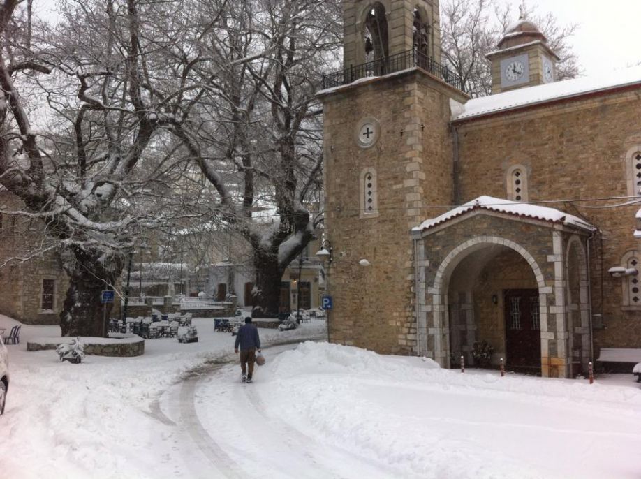 Οι αλυσίδες είναι απαραίτητες λόγω της ύπαρξης χιονιού και πάγου. Η θερμοκρασία στο χωριό είναι στους -5 C.