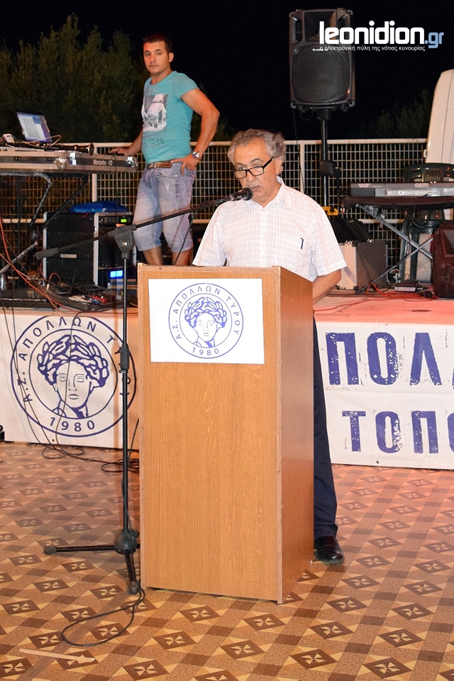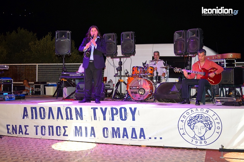 Πραγματοποιήθηκε τη Δευτέρα 31 Ιουλίου με μεγάλη επιτυχία η καθιερωμένη βραδιά Δημοτικού τραγουδιού του Α.Σ. Απόλλων Τυρού, στο γήπεδο μπάσκετ του Γυμνασίου Τυρού, με τους Γιάννη Σιέττο, Γωγώ Τσαμπά, Νίκο Βλαχοδήμο και Γιάννη Γκορίτσα.