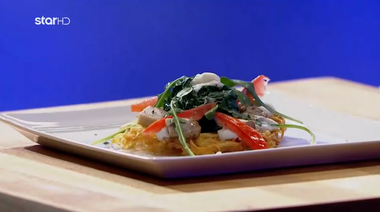 Το πιάτο που έφτιαξε ο Τάσος, σύμφωνα με τους κριτές, ήταν εξαιρετικό. Πρόκειται για μία παραδοσιακή κρητική συνταγή, αυγά με πατάτες, ανθόγαλο και απάκι, που του έδωσε την πολυπόθητη ποδιά του MacterChef.