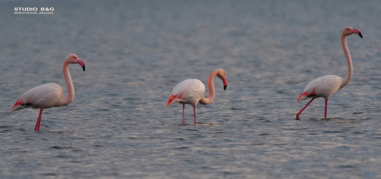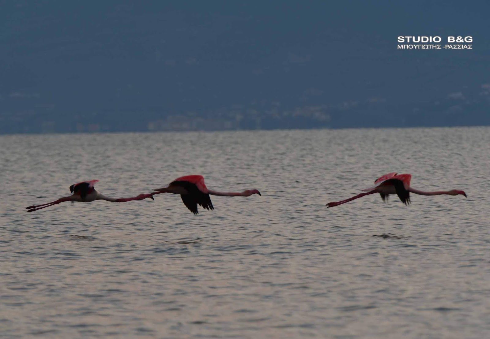 Τα διάσημα για το ροζ χρώμα τους αποδημητικά πουλιά σταθμεύουν εκμεταλλευόμενα την υψηλή θερμοκρασία των νερών του μυχού του Αργολικού κόλπου , που αποτελεί ιδανικό προορισμό αυτή την εποχή, Όπως είναι γνωστό, ο υδροβιότοπος της Αργολίδας αποτελεί τόπο στον οποίο συναντώνται μια σειρά από σπάνια είδη πουλιών.