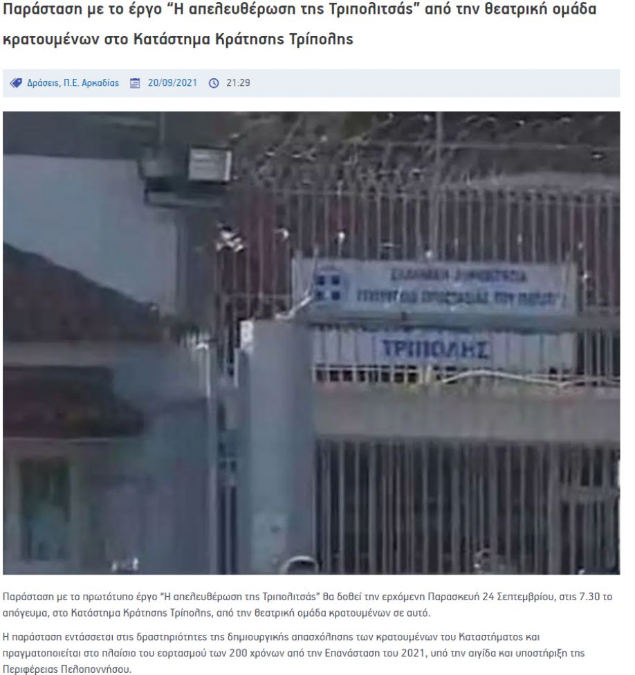 Παραθέτουμε αυτούσια την ανάρτηση στην επίσημη ιστοσελίδα της Περιφέρειας, με ημερομηνία 20/09/2021 και ώρα 21:29 με θέμα «Παράσταση με το έργο «Η απελευθέρωση της Τριπολιτσάς» από την θεατρική ομάδα κρατουμένων στο Κατάστημα Κράτησης Τρίπολης» όπου αναφέρει χαρακτηριστικά πώς η παράσταση «πραγματοποιείται στο πλαίσιο του εορτασμού των 200 Χρόνων από την Επανάσταση του 2021, υπό την Αιγίδα και υποστήριξη της Περιφέρειας Πελοποννήσου».
