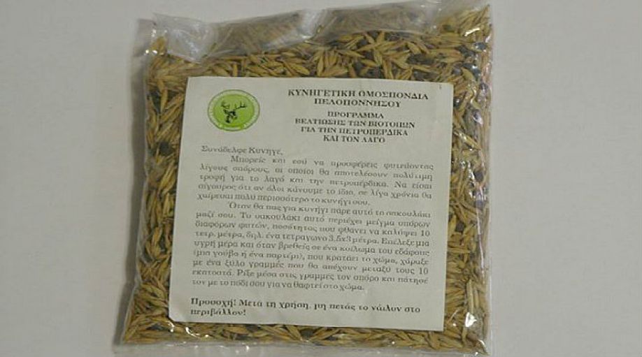 Έβδομη συνεχόμενη χρονιά η Κυνηγετική Ομοσπονδία Πελοποννήσου, μέσα από το πρόγραμμα που εκπονεί της βελτίωσης των βιοτόπων του λαγού και της πέρδικας, διένειμε και φέτος χιλιάδες σακουλάκια σπόρων σε κυνηγούς με την συνδρομή των Ομοσπονδιακών Θηροφυλάκων της. Το μέτρο αυτό έχει τύχει ιδιαίτερης αποδοχής από τους κυνηγούς της Πελοποννήσου οι οποίοι έχουν ενστερνιστεί την προσπάθεια αυτή και όλο και περισσότεροι ζητάνε να προμηθευτούν τα σακουλάκια με τους σπόρους, έχοντας αντιληφθεί τα θετικά αποτελέσματα της προσφοράς τους στο θήραμα.
