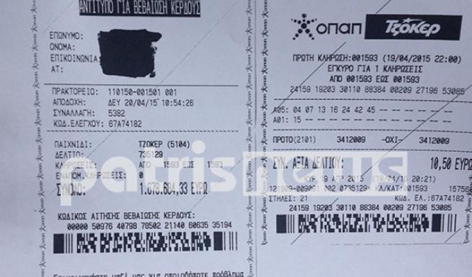 Ο τυχεροί αριθμοί που έδωσαν το ποσό του 1,7 εκατ. ευρώ είναι οι: 4,13, 24, 42, 45 και τζόκερ το 15.