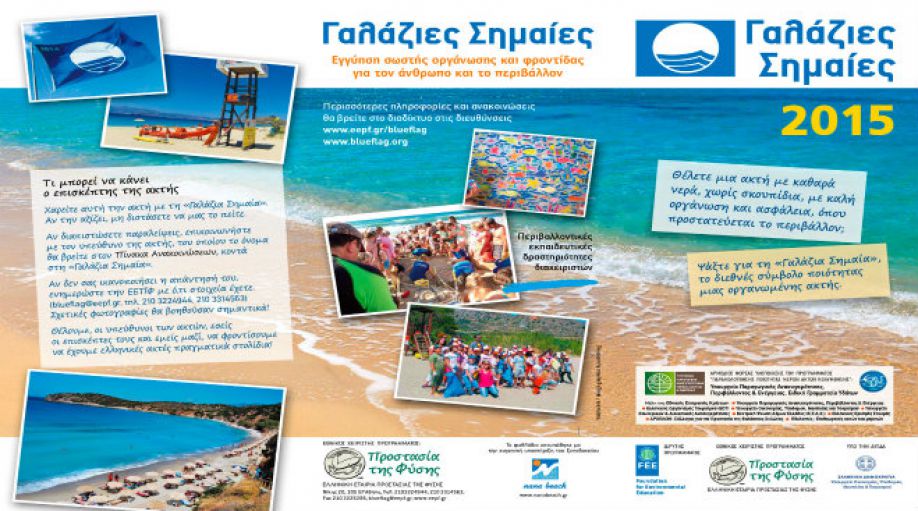 Ανακοινώθηκαν από την Ελληνική Εταιρία Προστασίας της Φύσης (ΕΕΠΦ), Εθνικό Χειριστή του Διεθνούς Προγράμματος "Γαλάζιες Σημαίες" στη χώρα μας, οι βραβεύσεις ακτών και μαρινών με "Γαλάζια Σημαία" για το 2015. Με 395 βραβευμένες ακτές, η Ελλάδα κατέχει την 3η θέση παγκοσμίως ανάμεσα σε 50 χώρες. Η Διεθνής Επιτροπή βράβευσε φέτος 3.468 ακτές και 695 μαρίνες σε όλο τον κόσμο. Γίνεται προσπάθεια, σε συνεργασία με αρμόδιους θεσμικούς φορείς, να αυξηθεί ο αριθμός των ελληνικών βραβευμένων ακτών και μαρίνων.