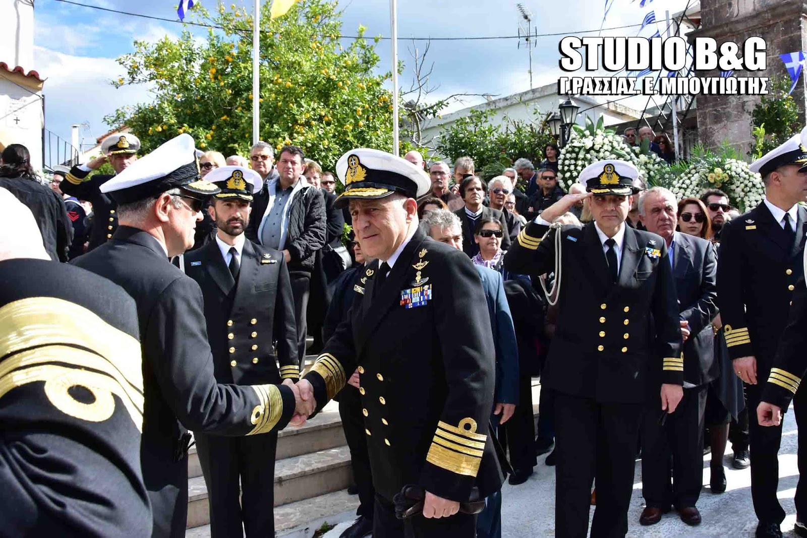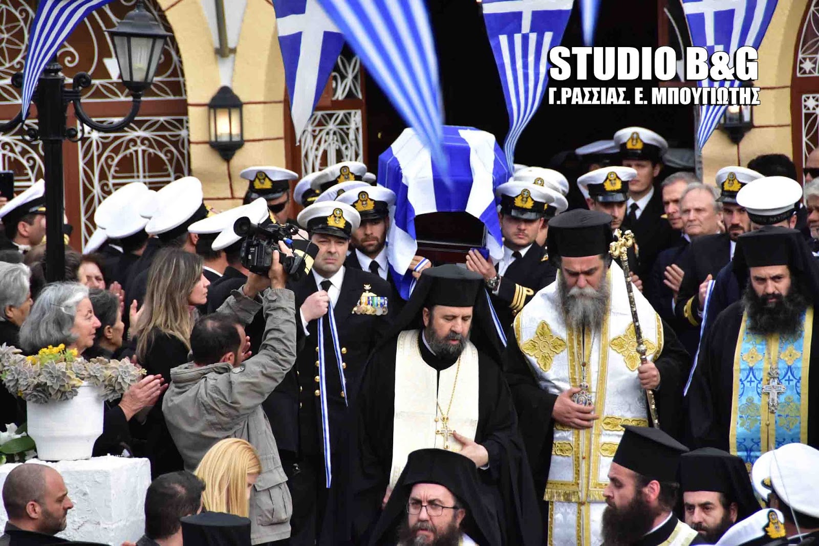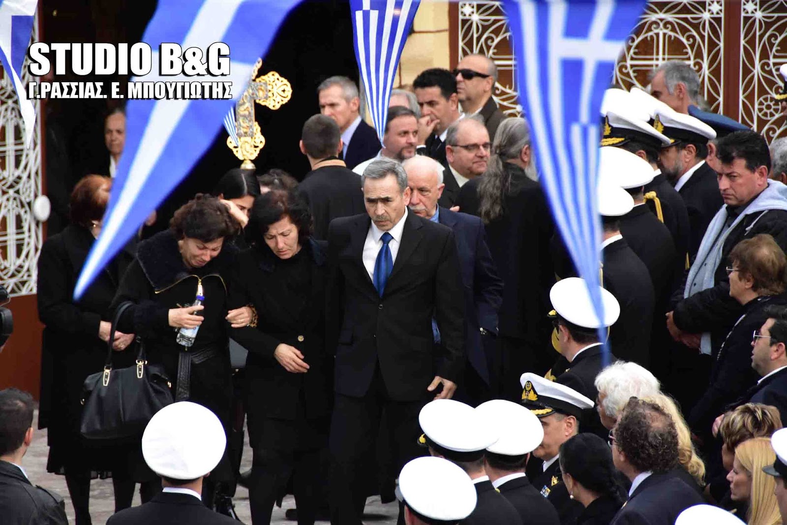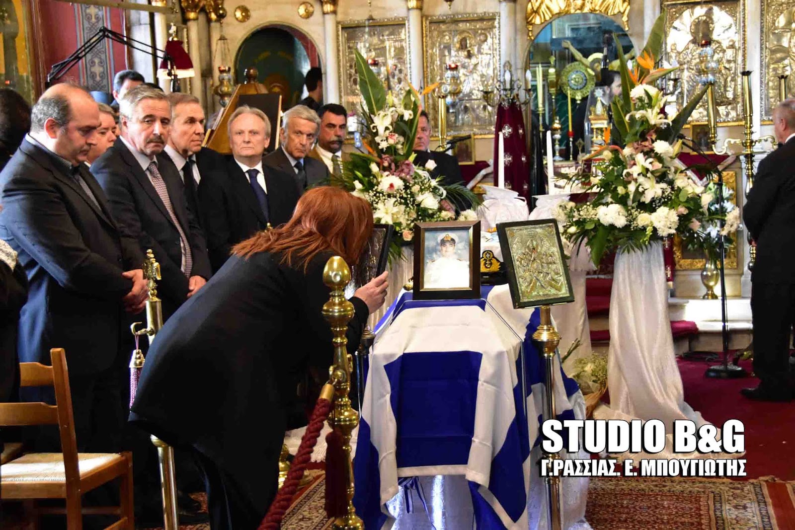 Στην εξόδιο ακολουθία, που εψάλη στον ιερό ναό Κοιμήσεως της Θεοτόκου Αρίας Ναυπλίου, χοροστούντος του Μητροπολίτη Αργολίδος Νεκταρίου καθώς και του Επισκόπου Επιδαύρου Καλλινίκου, παραβρέθηκαν ,ο αρχηγός ΓΕΕΘΑ Ευάγγελος Αποστολάκης, ο Αρχηγός ΓΕΝ Αντιναύαρχος Γιώργος Γιακουμάκης, οι βουλευτές Αργολίδος Γ.Γκιόλας ,Γ.Ανδριανός, Γ.Μανιάτης ,ο Αντιπεριφερειάρχης Αργολίδος Α.Χειβιδόπουλος, οι θεματικοί αντιπεριφερειάρχες Β.Σιδέρης, Φ.Στεφανόπουλος,ο Δήμαρχος Ναυπλιέων Δ.Κωστούρος , αντιδημαρχοι και δημοτικοί σύμβουλοι του Δήμου Ναυπλιέων και πάρα πολύς κόσμος από όλη την Αργολίδα.