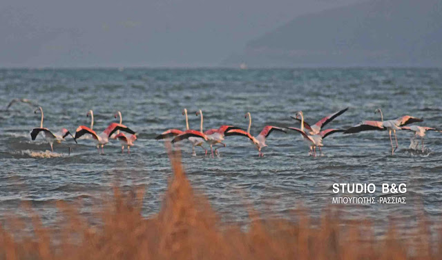 Το σμήνος από τα πανέμορφα φοινικόπτερα (Phoenicopterus ruber), γνωστά και ως φλαμίνγκο, έφτασαν χθες το απόγευμα στο ξεχωριστό υδροβιότοπo Ναυπλίου Νέας Κίου για να ξεκουραστούν από το μακρύ ταξίδι της δεύτερης μεταναστευτικής περιόδου από τον νότο προς τον βορά.