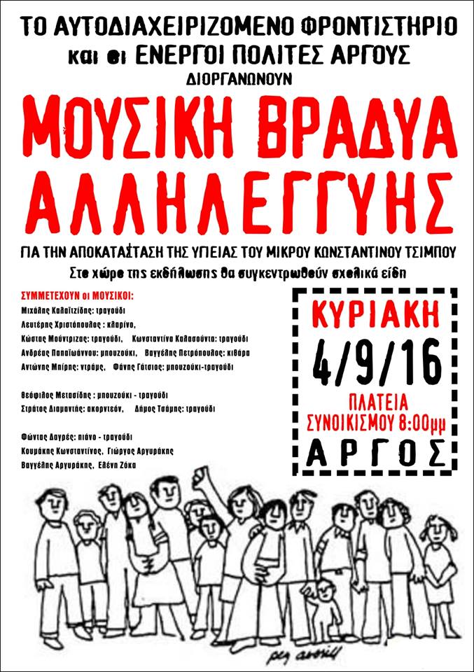Το Αυτοδιαχειριζόμενο Φροντιστήριο και οι Ενεργοί Πολίτες Άργους, διοργανώνουν Μουσική Βραδυά στην πλατεία Συνοικισμού Άργους στις 4 Σεπτεμβρίου 2016 στις 8:00μ.μ.