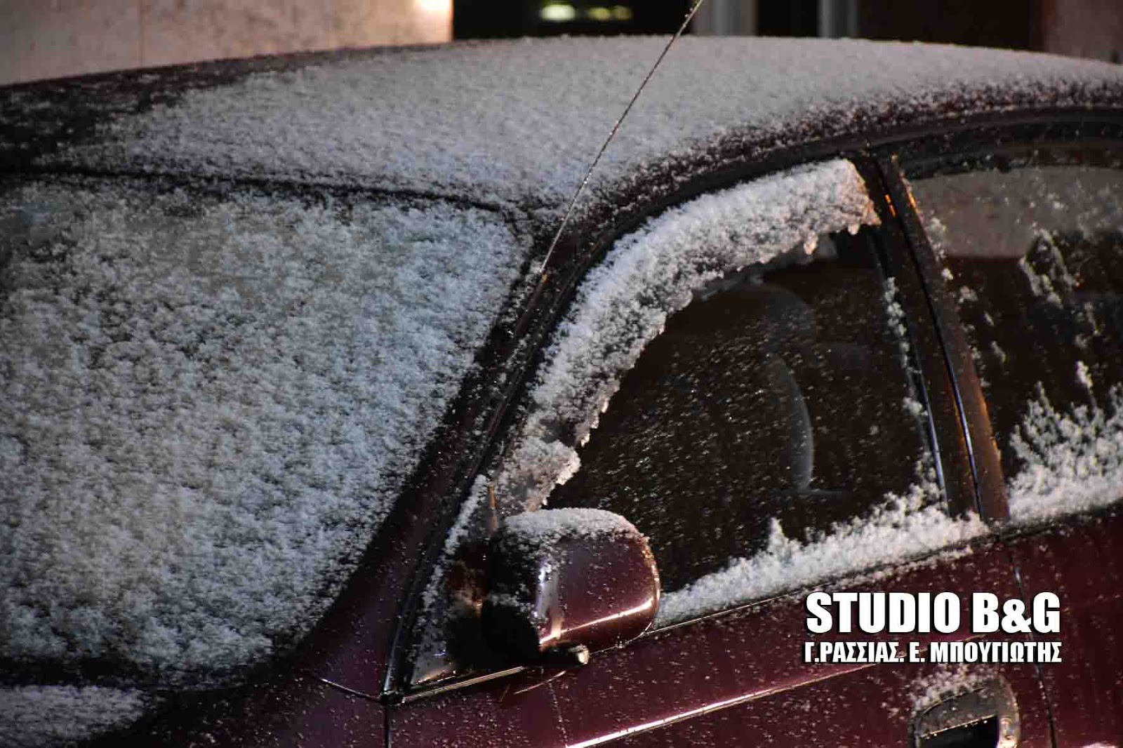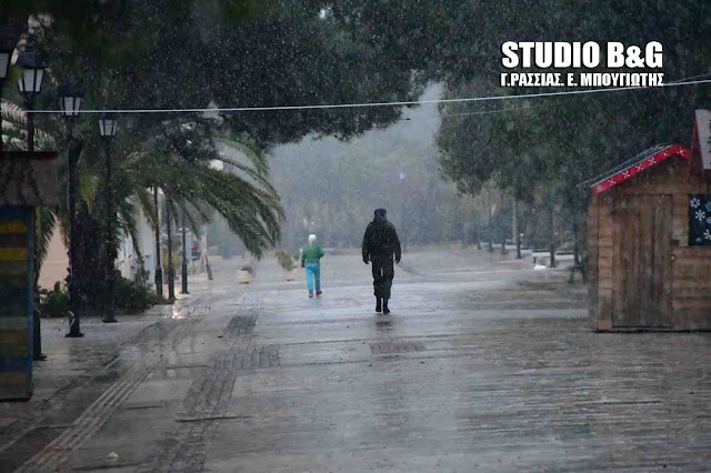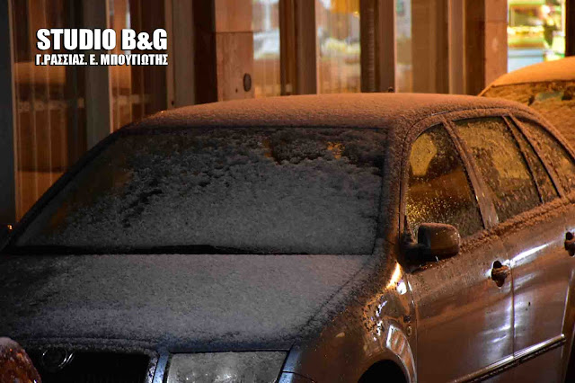 Έντονη χιονόπτωση σημειώθηκε και στο Ναύπλιο το απόγευμα του Σαββάτου ασπρίζοντας τις στέγες των σπιτιών και τα παρμπρίζ των αυτοκινήτων.