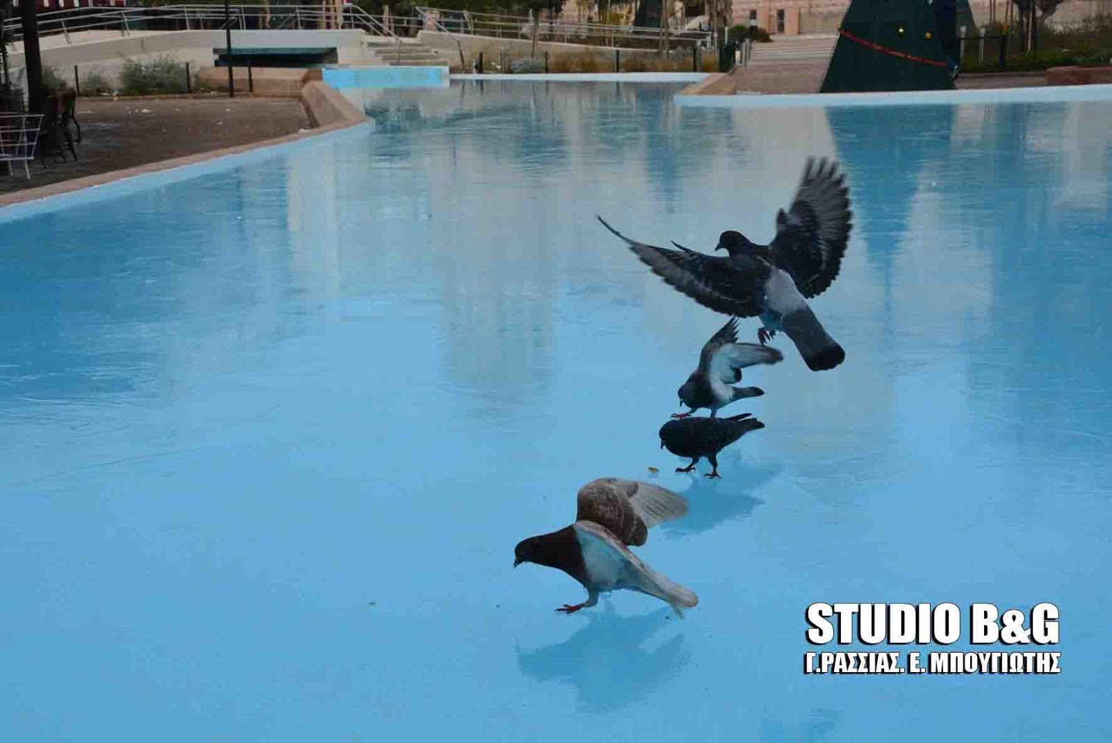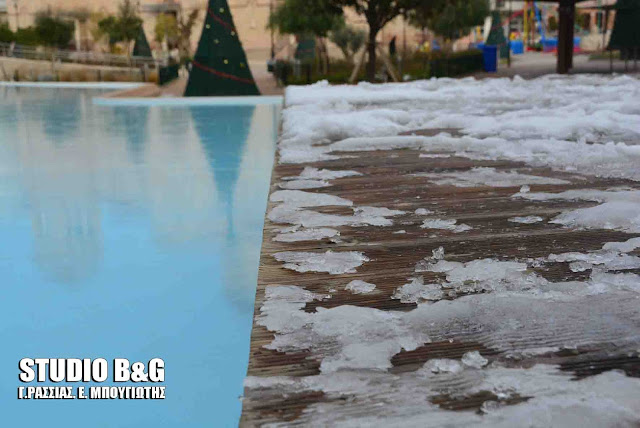 Μέχρι και η λίμνη στην πλατεία του Αγίου Πέτρου στο Άργος πάγωσε από τις χαμηλές θερμοκρασίες.