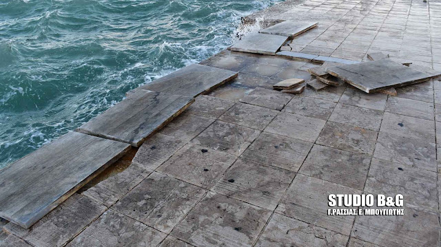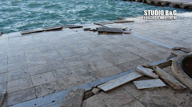 Στο Ναύπλιο ξηλώθηκαν στην κυριολεξία ακόμα και οι πλάκες και τα μάρμαρα του μόλου, ενώ εκτεταμένες ζημιές σημειώθηκαν σε καταστήματα καφέ και εστιατόρια που είδαν τις τέντες και τα τραπεζοκαθίσματα σήμερα το πρωί ένα κουβάρι.