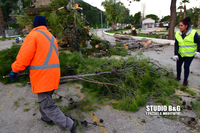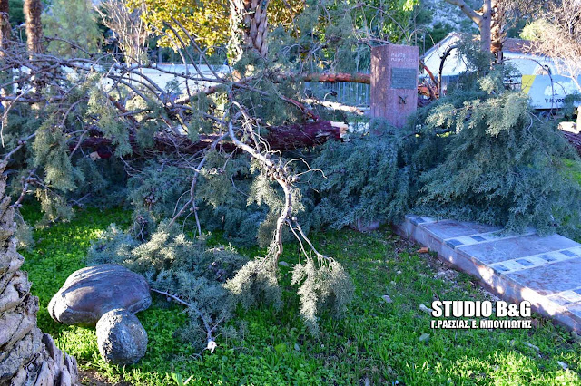 Επίσης πολλές τζαμαρίες έσπασαν ενώ ένα μεγάλο δέντρο έπεσε έξω από το 3ο Δημοτικό Σχολείο Ναυπλίου στην πλατεία Εθνοσυνέλευσης. Από την νύχτα τα συνεργεία του Δήμου βρίσκονται σε εγρήγορση με επικεφαλής τον Αντιδήμαρχο Σταύρο Γαβρήλο ο οποίος μίλησε την νύχτα και κατά την διάρκεια της καταιγίδας στην κάμερα των Αργολικών Ειδήσεων: