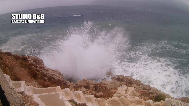 Τεράστια κύματα στην παραλία Καραθώνας έφερε ο "Ζορμπάς" (vd)