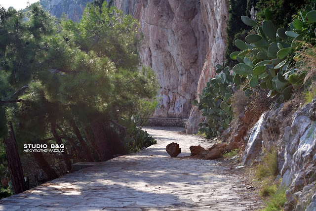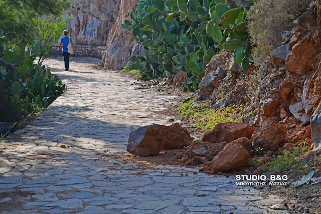 Η υπηρεσία πολιτικής προστασίας του Δήμου Ναυπλίου έχε αποκλείσει τις εισόδους του πεζόδρομου έχοντας βάλει προειδοποιητικές πινακίδες κινδύνου και κάγκελα.