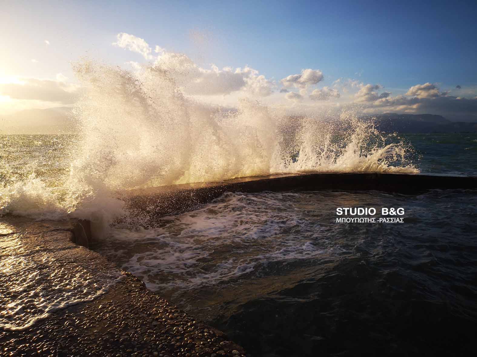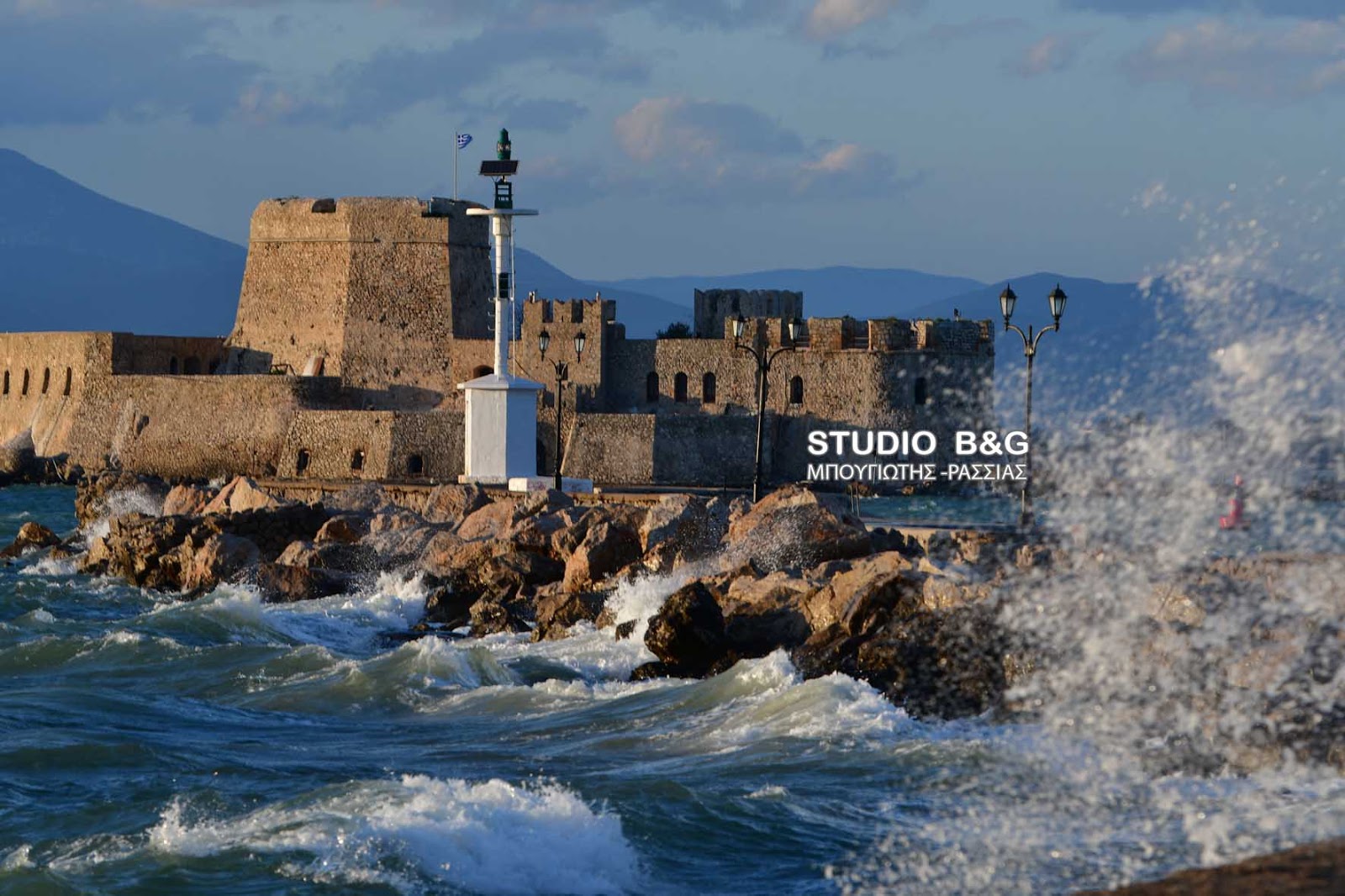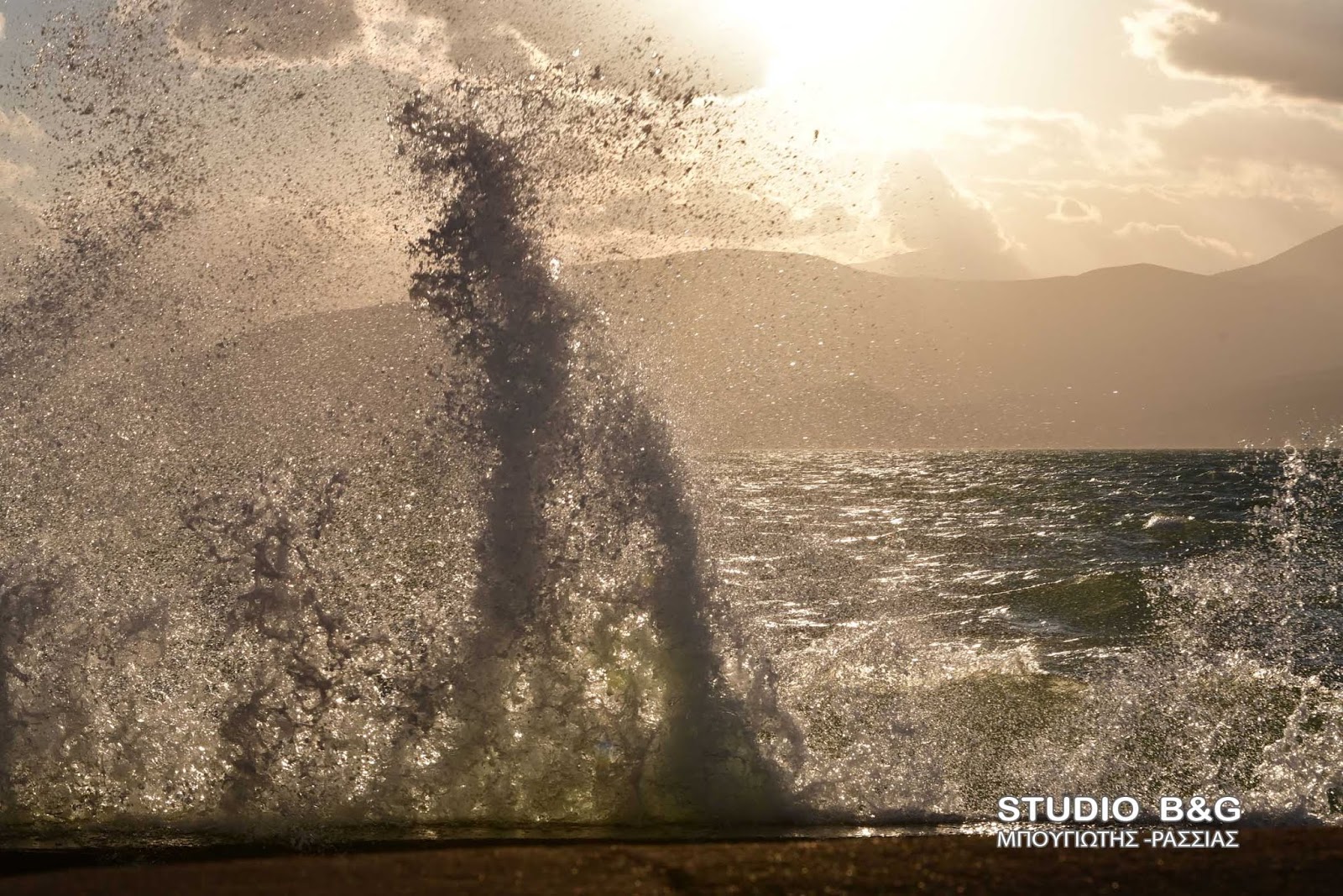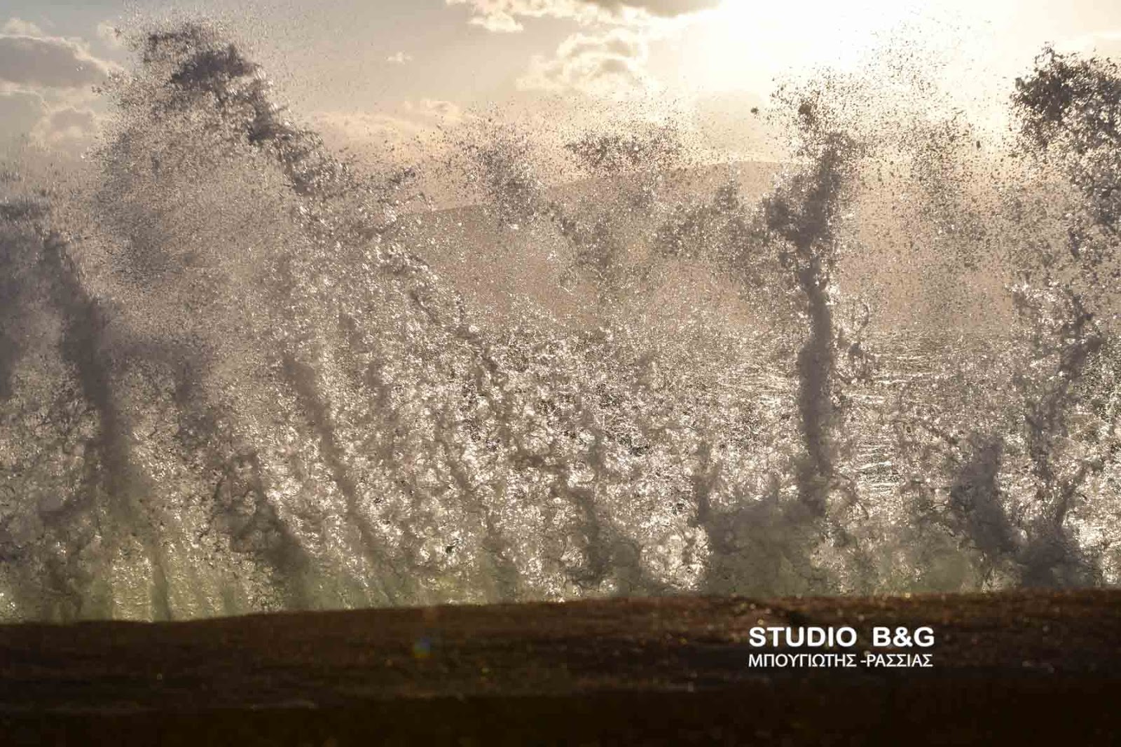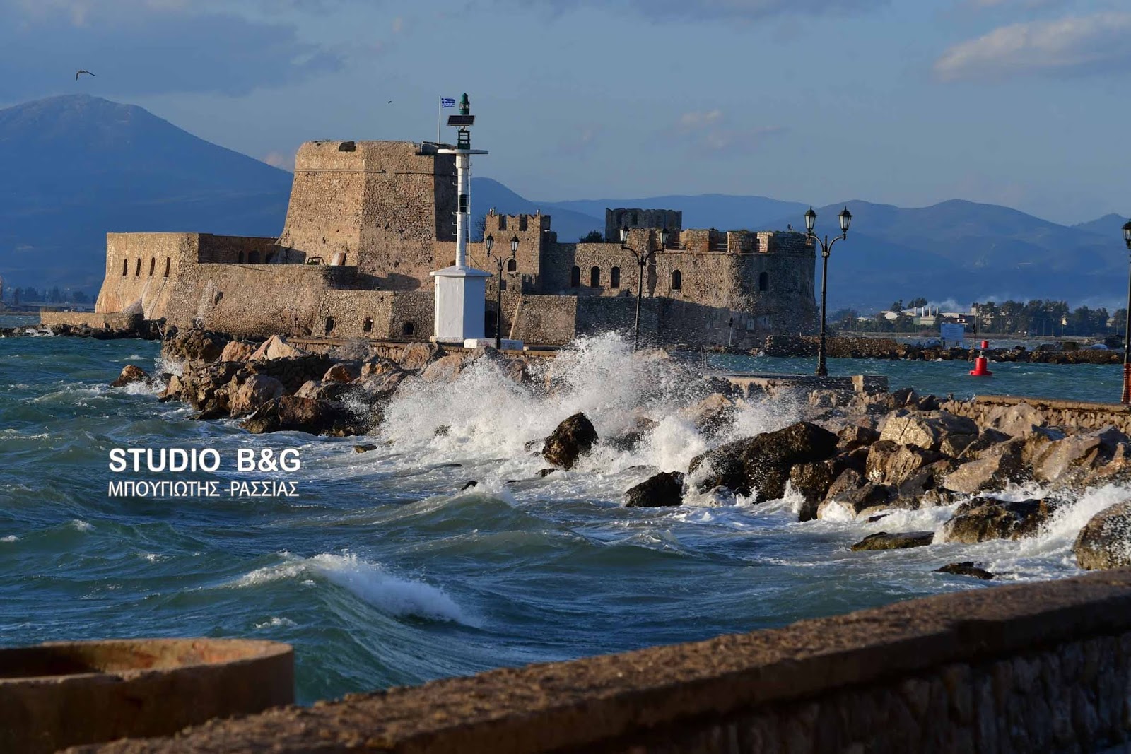 Η επερχόμενη κακοκαιρία δείχνει τα δόντια της και στην Αργολική πρωτεύουσα με τα κύματα από τους θυελλώδεις ανέμους να χτυπούν δυνατά την περιοχή του λιμενοβραχίονα.