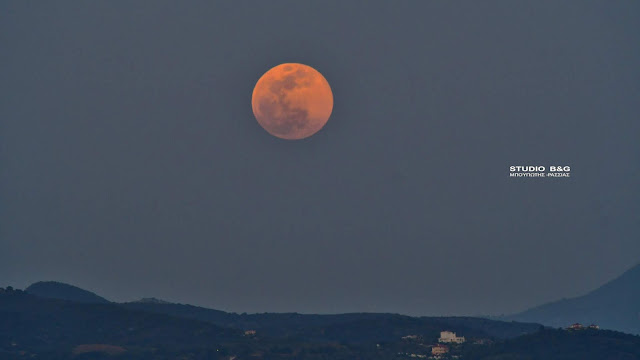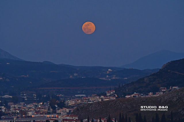 Το φεγγάρι ανέτειλε πάνω από την πόλη του Ναυπλίου κατά τη διάρκεια της δεύτερης Υπερ-Σελήνης του 2019 την Τρίτη 19 Φεβρουαρίου 2019.