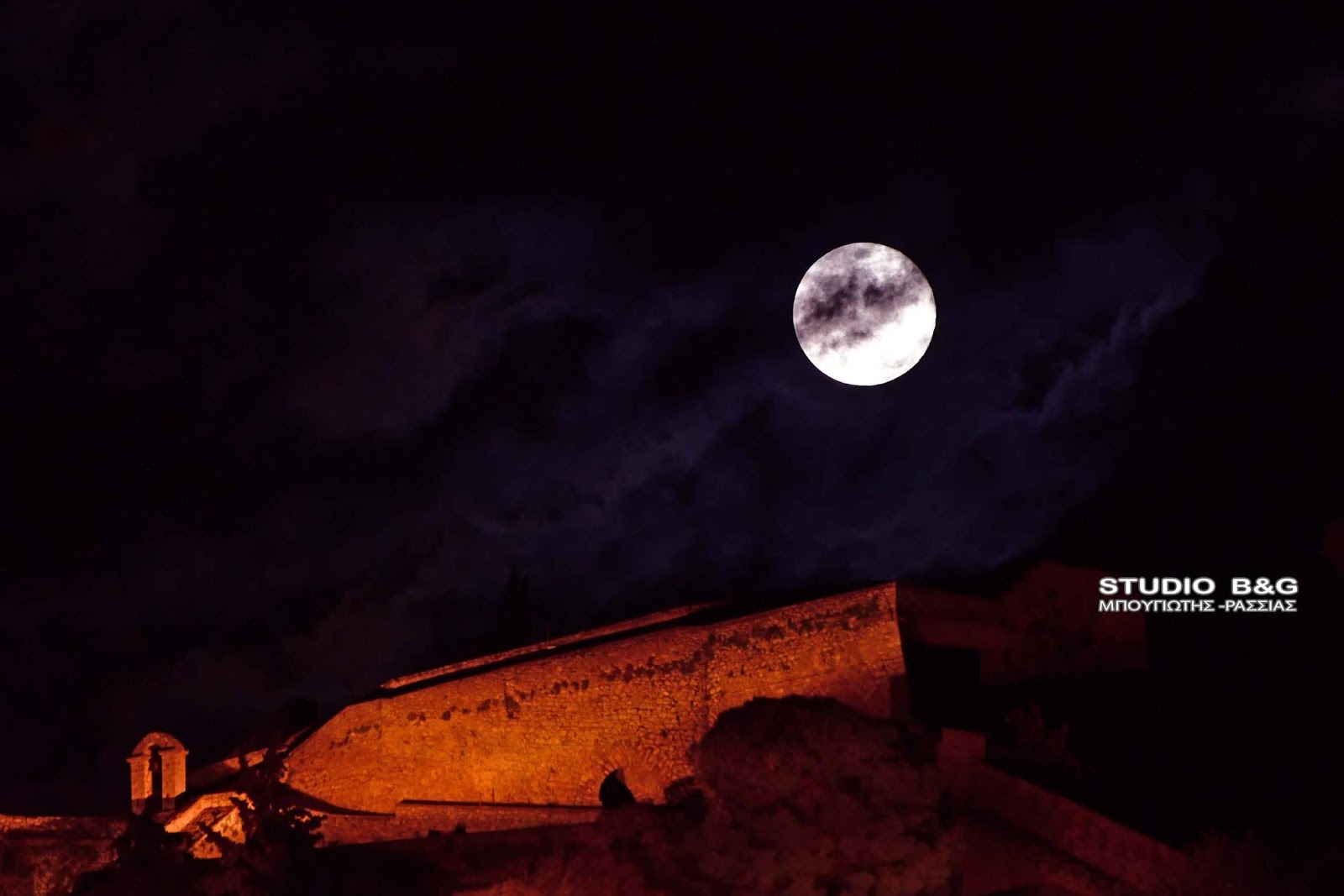 Η εντυπωσιακή "Ροζ Πανσέληνος" του Απριλίου στο Ναύπλιο πάνω από το Παλαμήδι (vd)