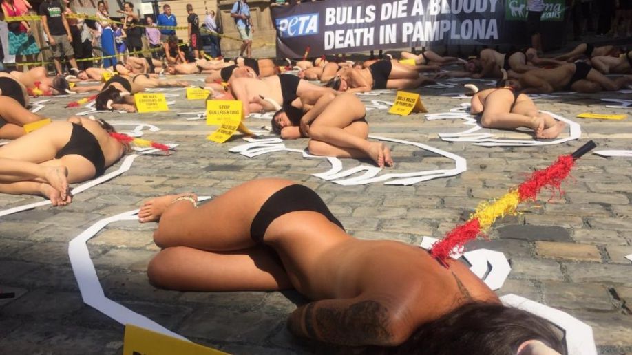 Δεκάδες ημίγυμνοι διαδηλωτές ξάπλωσαν σήμερα στον δρόμο με ψεύτικες λόγχες να προεξέχουν από τις πλάτες τους, την παραμονή του ισπανικού φεστιβάλ του Σαν Φερμίν, σε μια αναπαράσταση της τεχνικής που χρησιμοποιούν οι ταυρομάχοι εναντίον των εξασθενημένων ταύρων κατά τη διάρκεια της ταυρομαχίας.