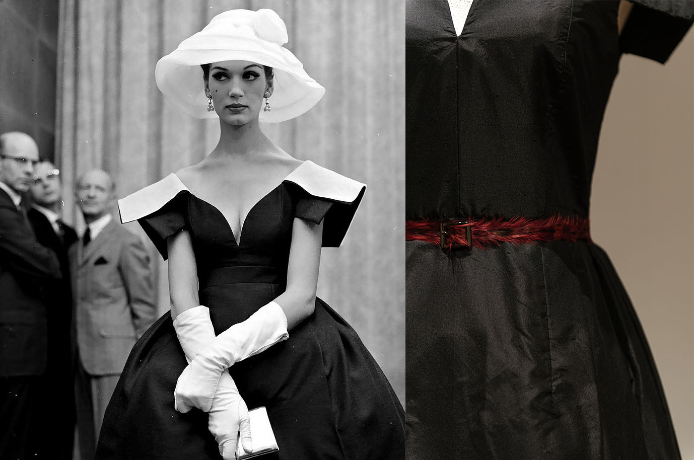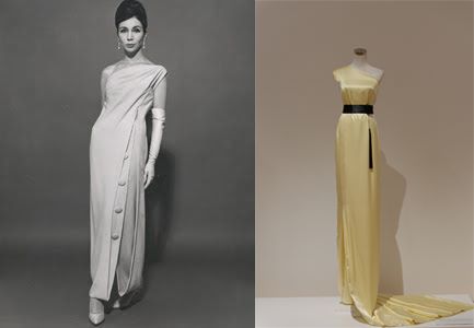 - 4. H Mildred Custin διετέλεσε πρόεδρος της εταιρείας Bonwit Teller, εταιρεία στην οποία άνηκε σειρά πολυκαταστημάτων με εξειδίκευση στα ενδύματα υψηλού κόστους, με έδρα τη Νέα Υόρκη, από το 1965 μέχρι το 1970. Το 1963 ανακάλυψε τον Έλληνα Γιώργο Σταυρόπουλο και αγόρασε τα πρώτα του σχέδια. Το συγκεκριμένο φόρεμα υπήρξε ένα από τα πρώτα του σχεδιαστή που εκείνη επέλεξε και ανέδειξε. Ο Σταυρόπουλος είχε στενές σχέσεις με τους καλύτερους αγοραστές του και θα ταξίδευε στις τοποθεσίες τους έξω από τη Νέα Υόρκη για να παρουσιάσει τις τελευταίες του συλλογές. Η πελατειακή βάση του Σταυρόπουλου περιελάμβανε τις κυρίες της υψηλής κοινωνίας, τις συζύγους κυβερνητικών αξιωματούχων και διασημοτήτων. Όλοι έβρισκαν τις δημιουργίες του κατάλληλες για τα υψηλών απαιτήσεων γεγονότα που έπρεπε να παρευρεθούν. Η σύγχρονη παραλλαγή του φορέματος είναι δημιουργία της σπουδάστριας Ευανθίας Στεφανοπούλου.