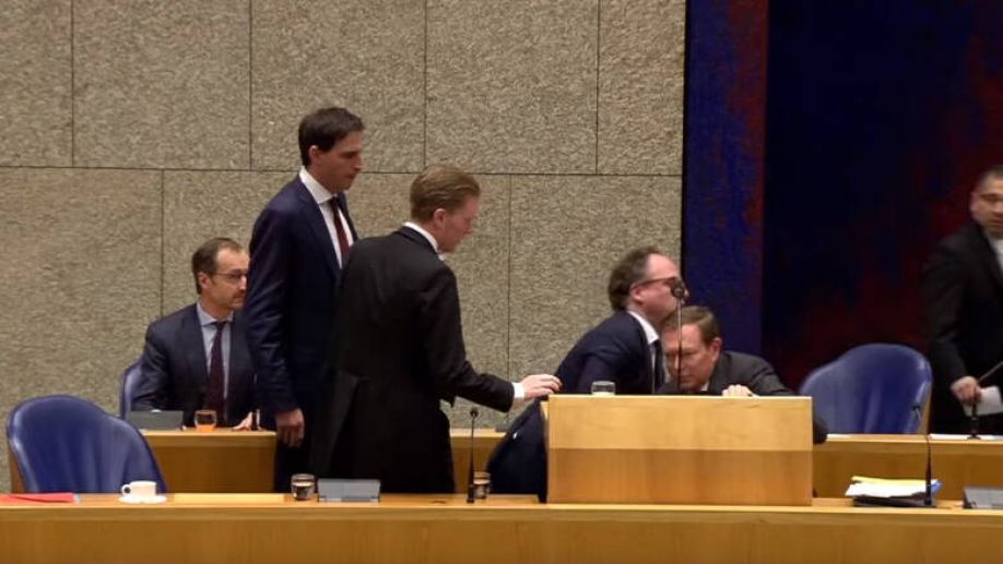 Ο Μπρούνο Μπρούινς φαίνεται πως έχασε τις αισθήσεις του κι έπεσε πίσω από το αναλόγιο, στο βήμα των ομιλητών, την ώρα που δεχόταν ερωτήσεις. Συνάδελφοί του υπουργοί έσπευσαν να τον βοηθήσουν.